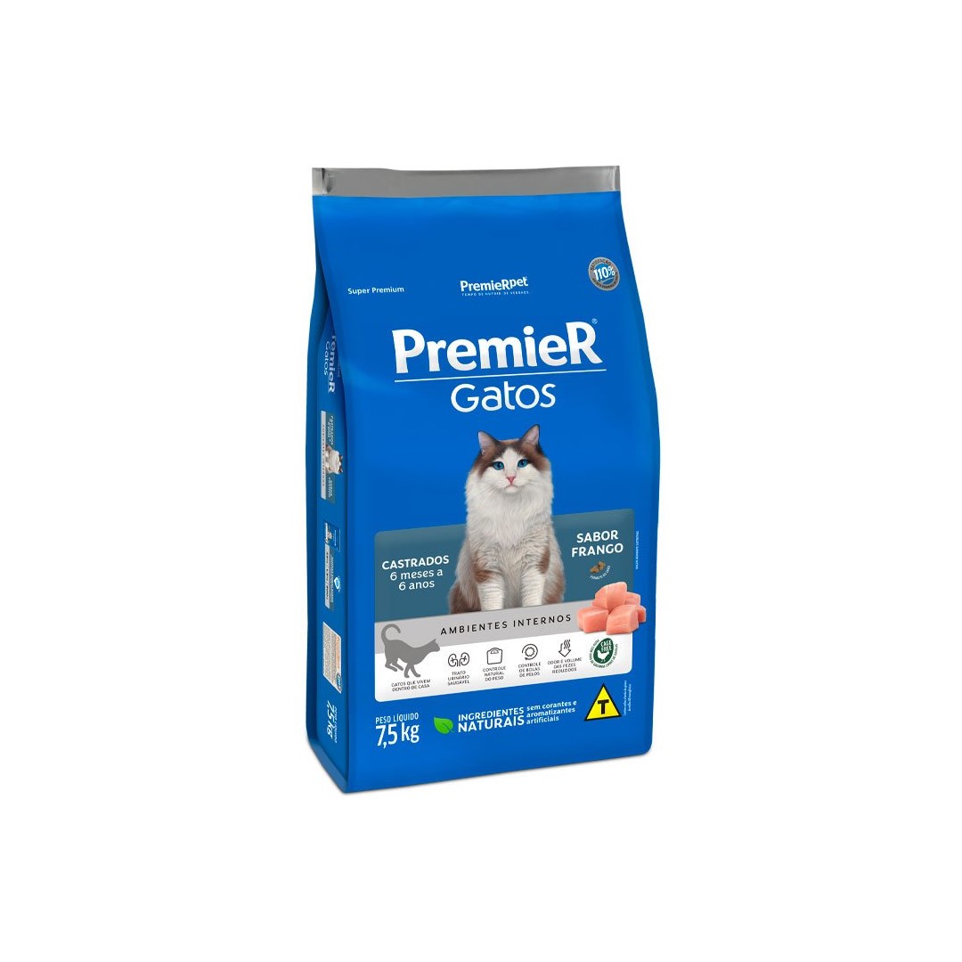 RAÇÃO PREMIER GATOS CASTRADOS 6 MESES A 6 ANOS FRANGO Tamanho:7,5KG